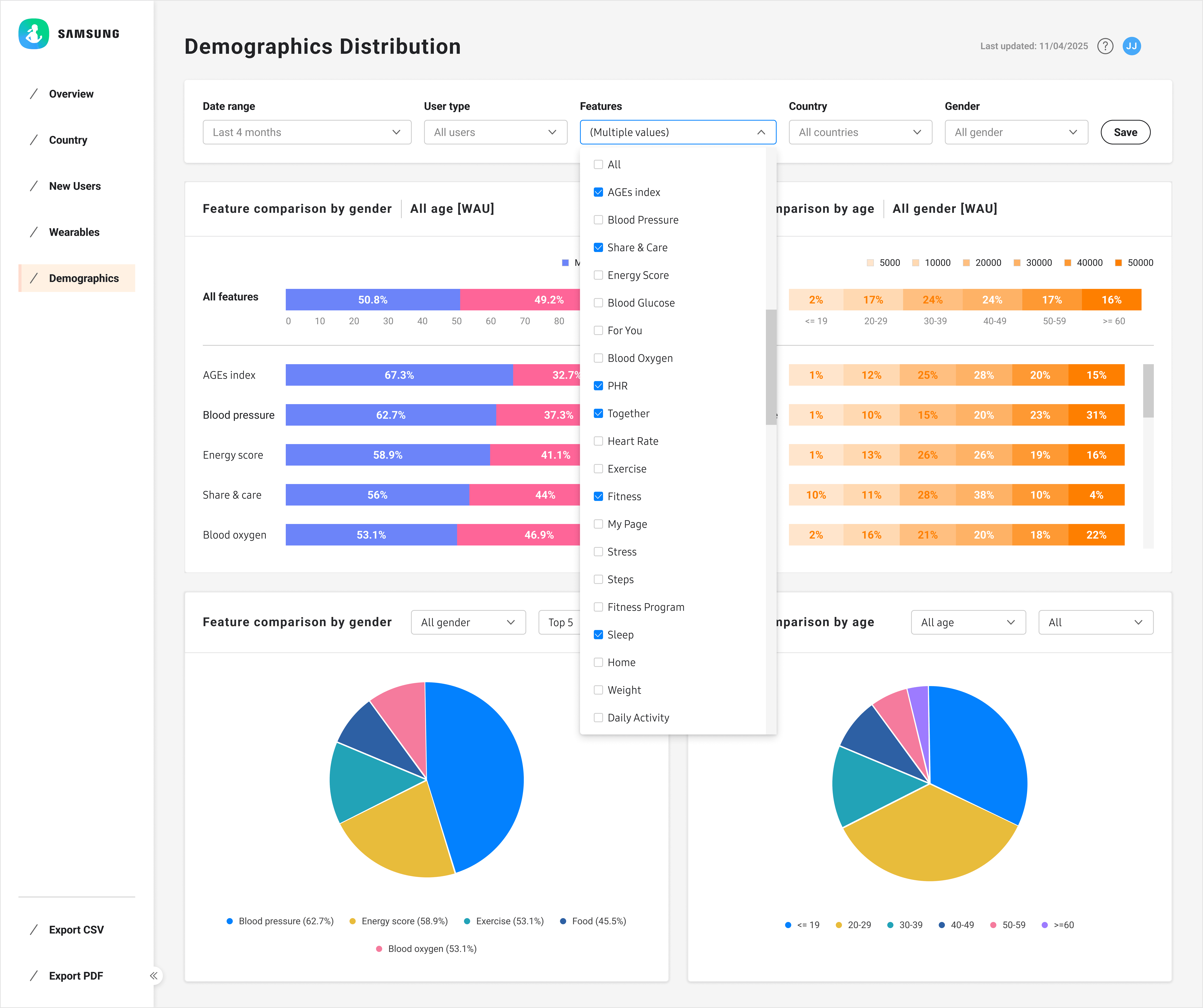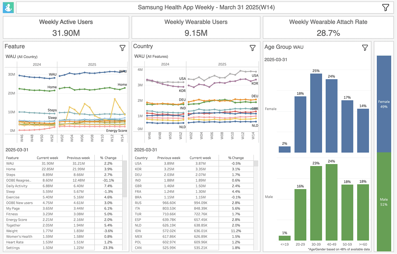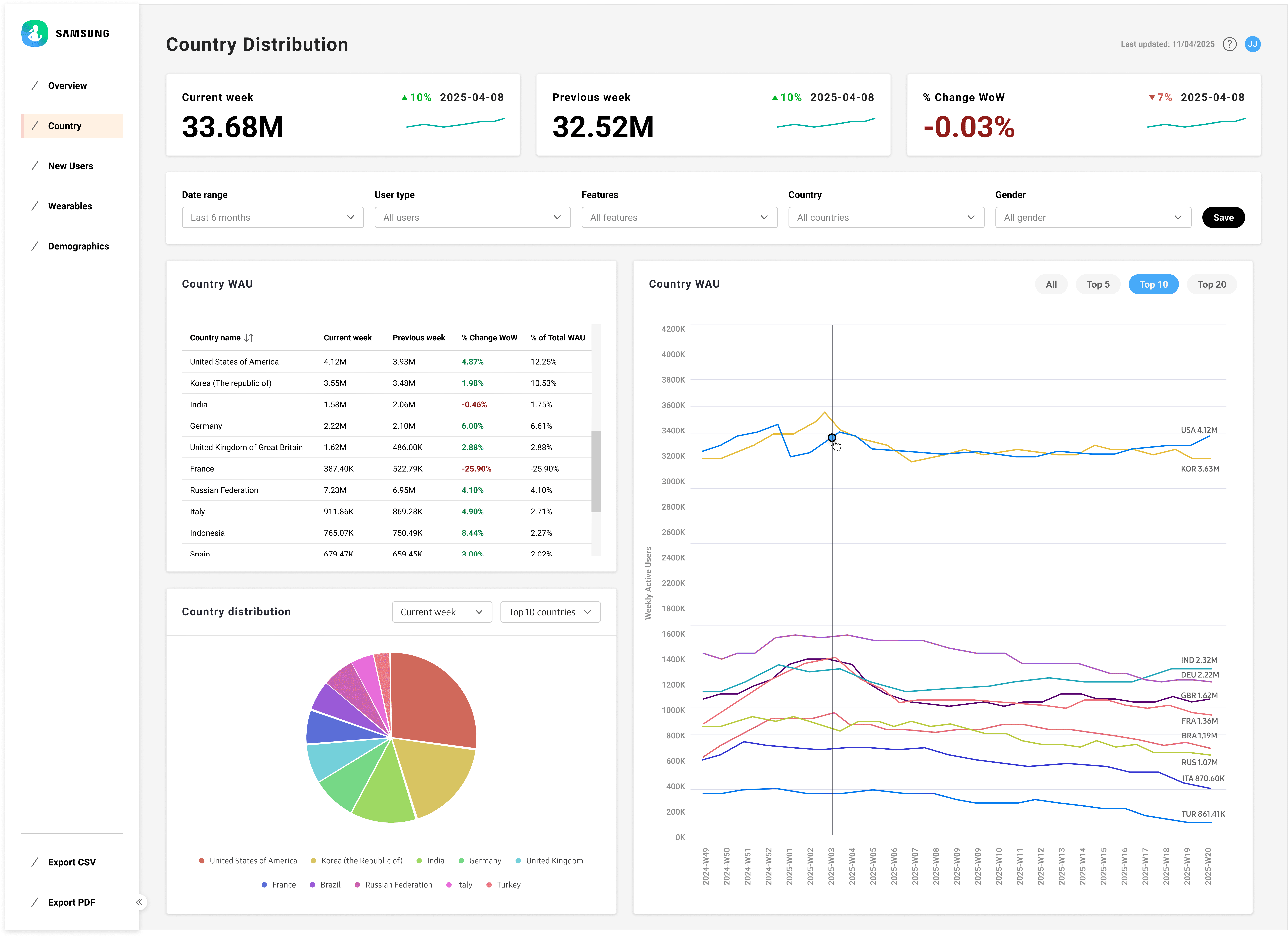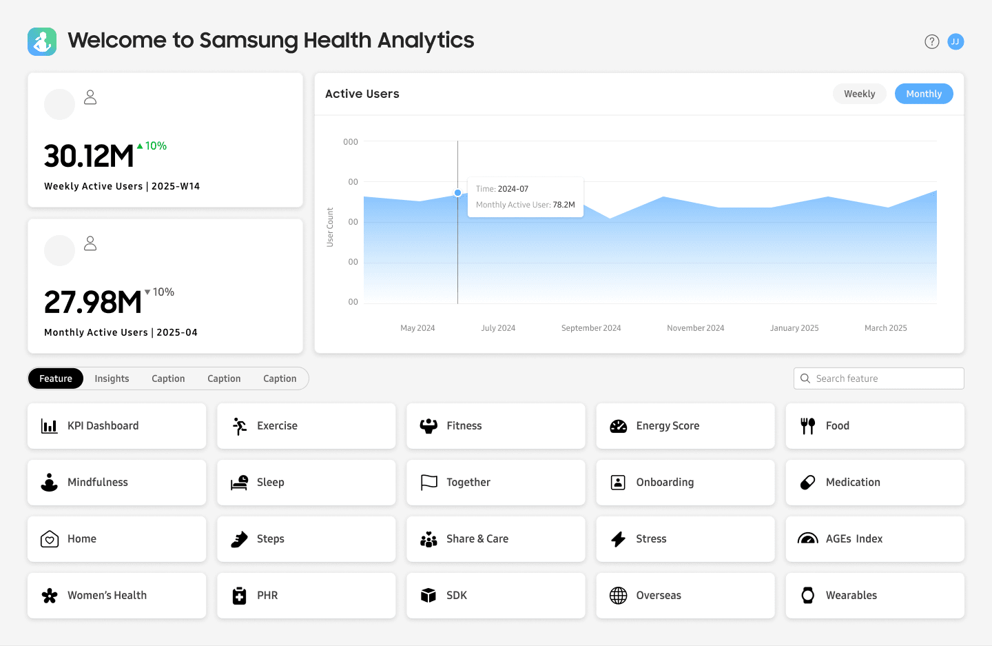 Samsung Health generates terabytes of engagement data across millions of global devices. For Vice Presidents and Product Leaders at HQ, accessing this data is critical for roadmap planning. My role was to transform this raw volume into actionable intelligence. I designed a logic-driven analytics dashboard that allows stakeholders to filter complex user cohorts (e.g., 'Mobile-Only' vs. 'Wearable') without statistical errors.
