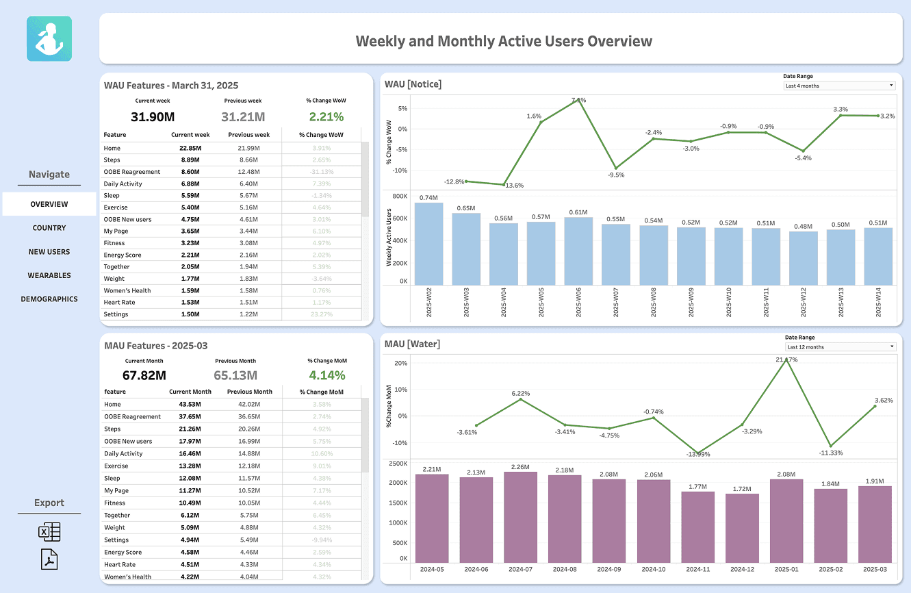 The new architecture unified 3 disparate reports into one master view. Executive VPs could now toggle between 'Mobile' and 'Wearable' cohorts instantly, trusting that the user counts were accurate. This reduced weekly reporting time from 2 days to 30 seconds.